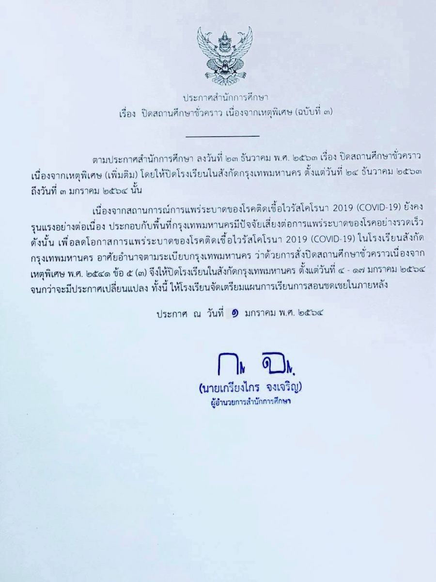 คำสั่งปิดโรงเรียนสังกัดกรุงเทพมหานครตั้งแต่วันที่ 4-17 มกราคม 2564 เนื่องจากสถานการณ์การแพร่ระบาดของโรคติดเชื้อไวรัสโคโรนา 2019