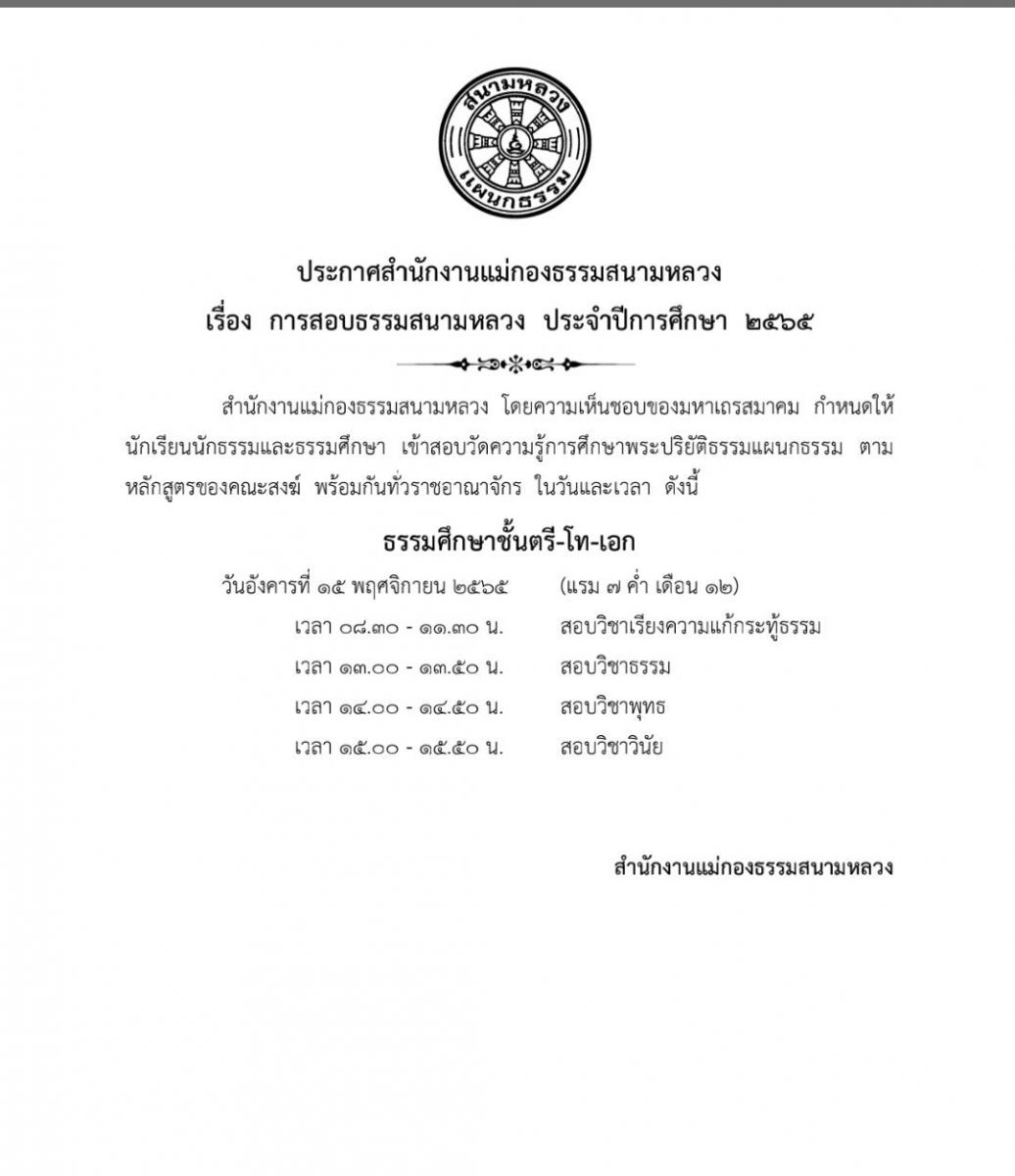 การสอบธรรมสนามหลวง ประจำปีการศึกษา 2565 วันอังคาร ที่ 15 พฤศจิกายน 2565