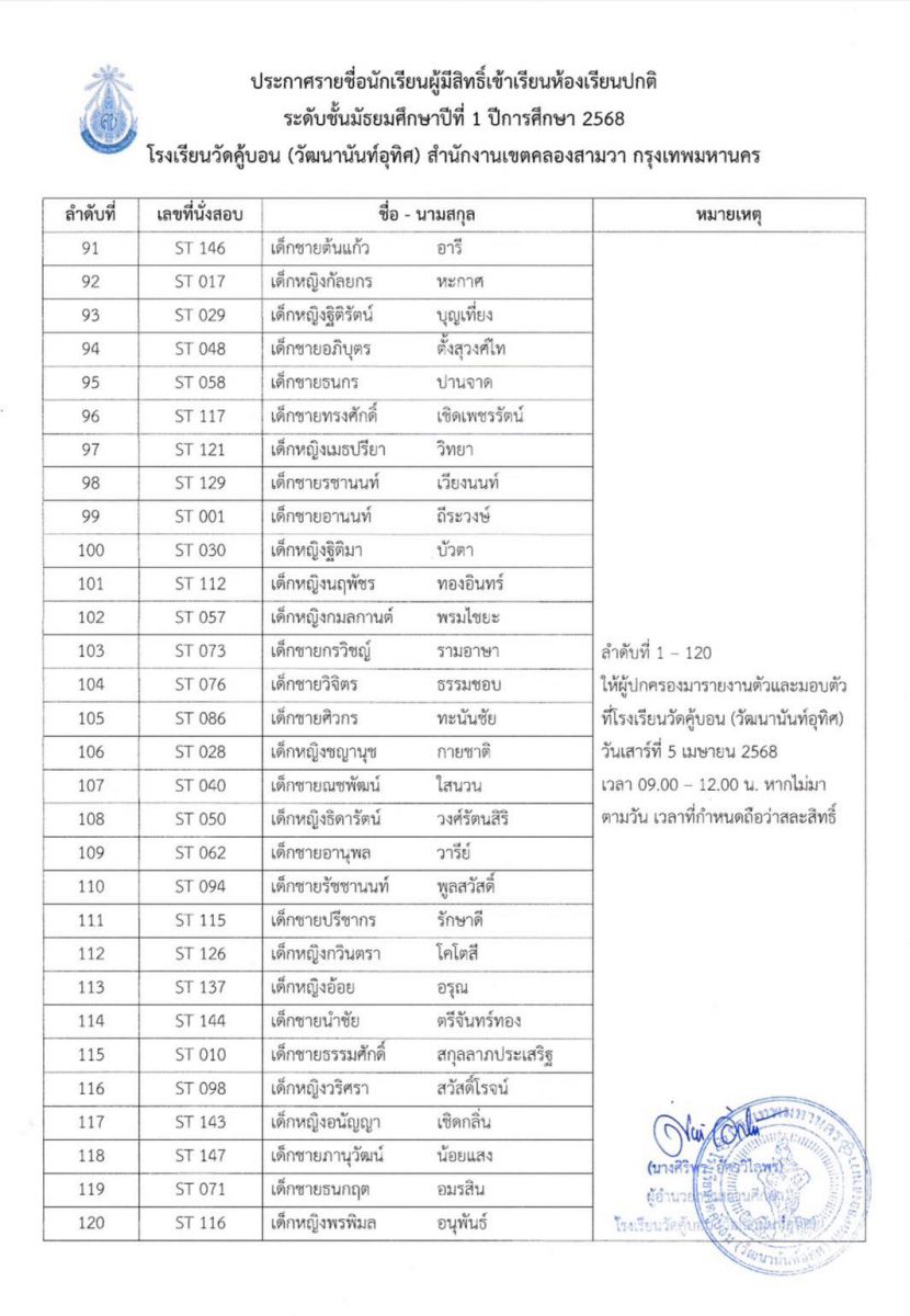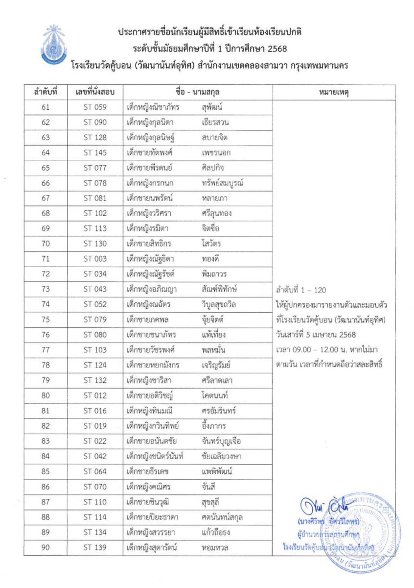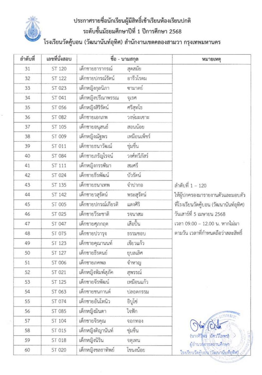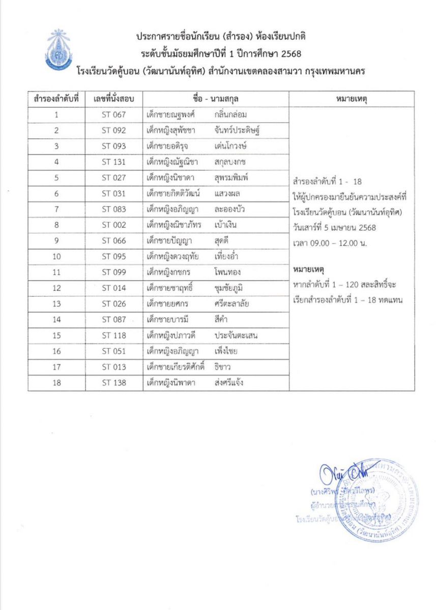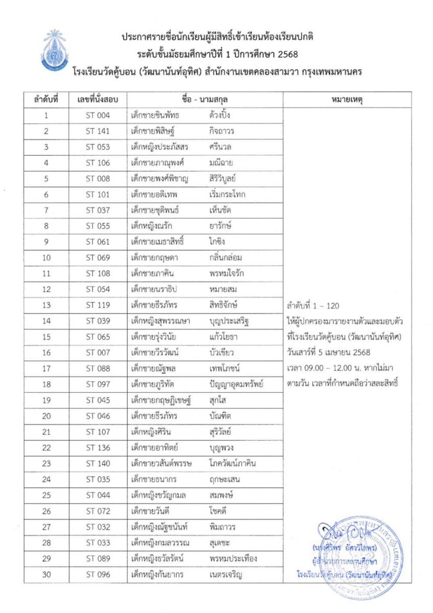 ประกาศรายชื่อนักเรียนผู้มีสิทธิ์เข้าเรียนห้องเรียนปกติ ระดับชั้นมัธยมศึกษาปีที่ 1 ปีการศึกษา 2568
