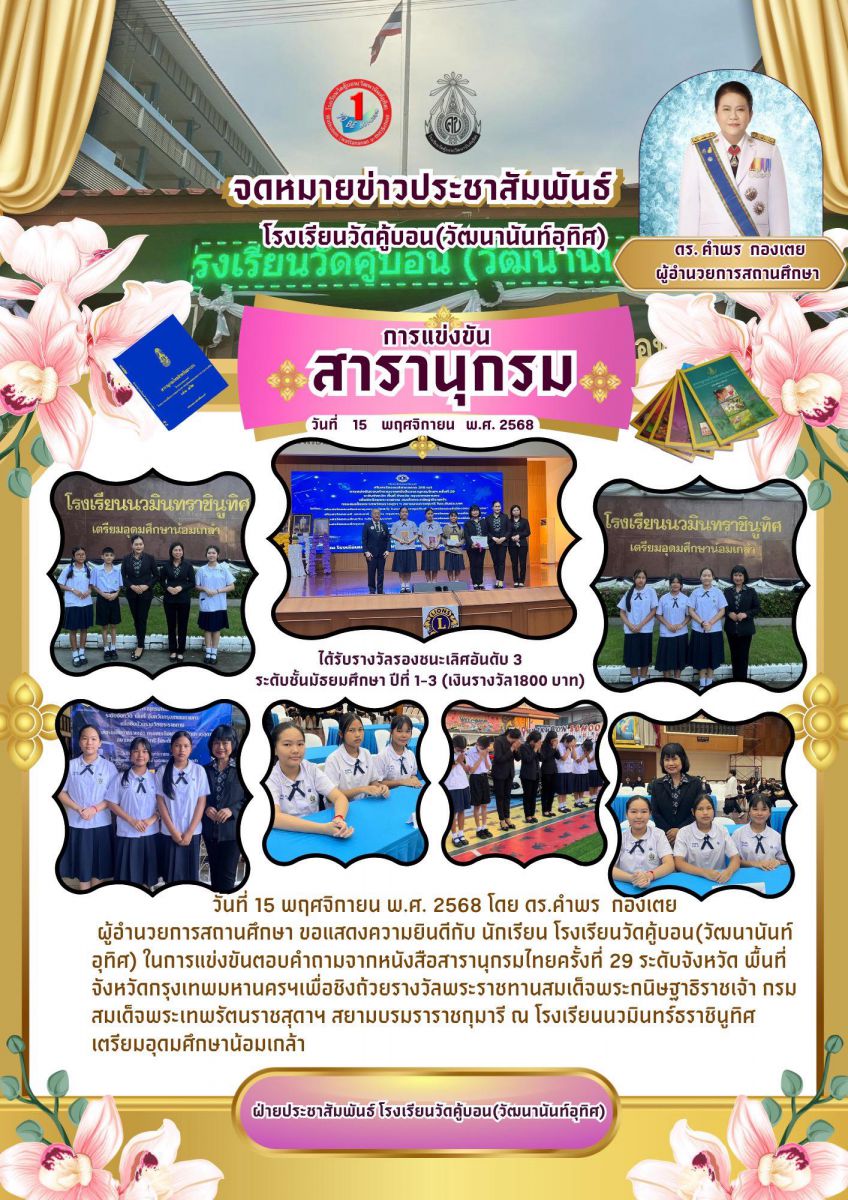 วันที่ 15 พฤศจิกายน 2568 โรงเรียนวัดคู้บอน (วัฒนานันท์อุทิศ)โดย ดร.คำพร กองเตย ผู้อำนวยการสถานศึกษา ขอแสดงความยินดีกับตัวแทนนักเรียน ได้แก่